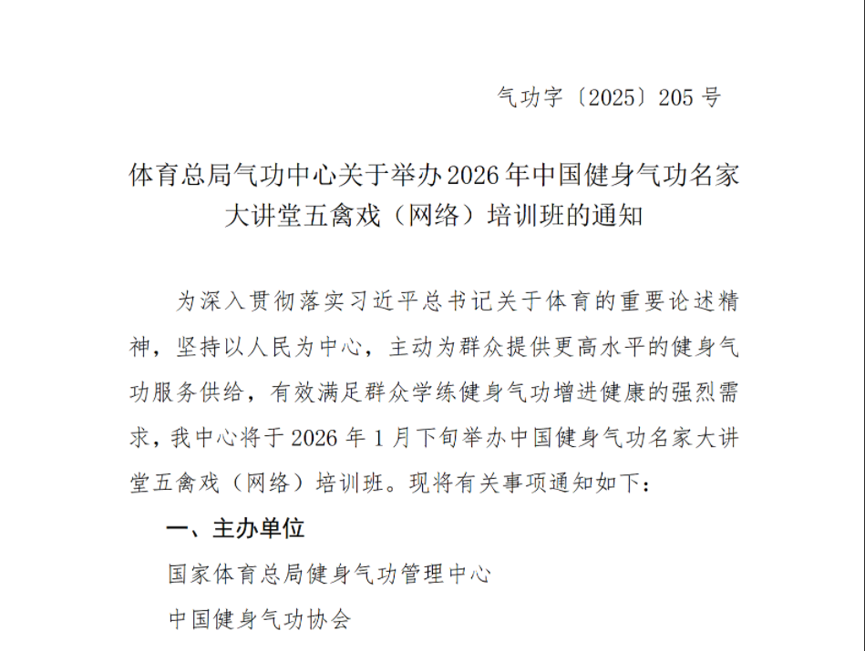 体育总局气功中心关于举办2025年健身气功名家大讲堂五禽戏网络培训班的通知