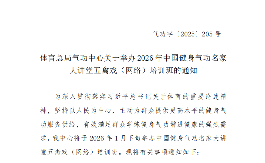 体育总局气功中心关于举办2026年中国健身气功名家大讲堂五禽戏(网络)培训班的通知