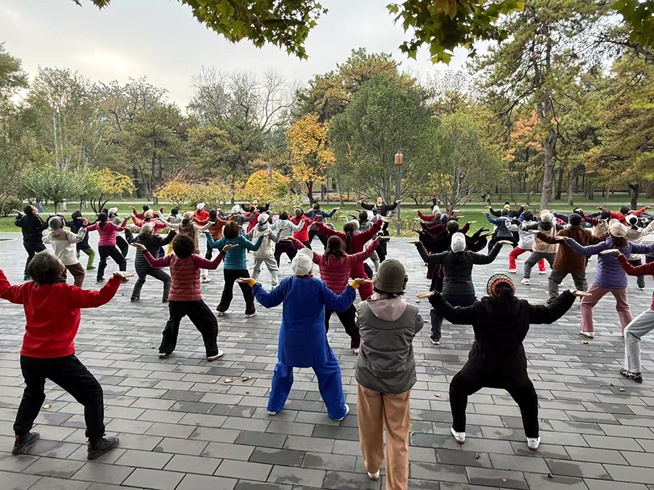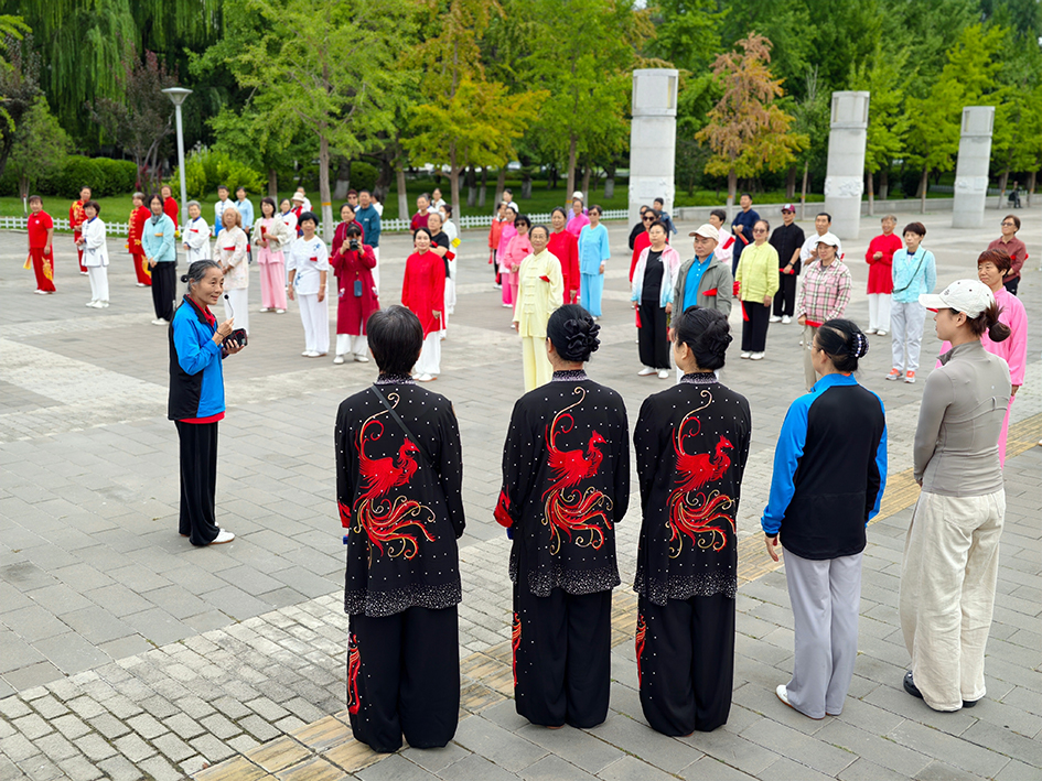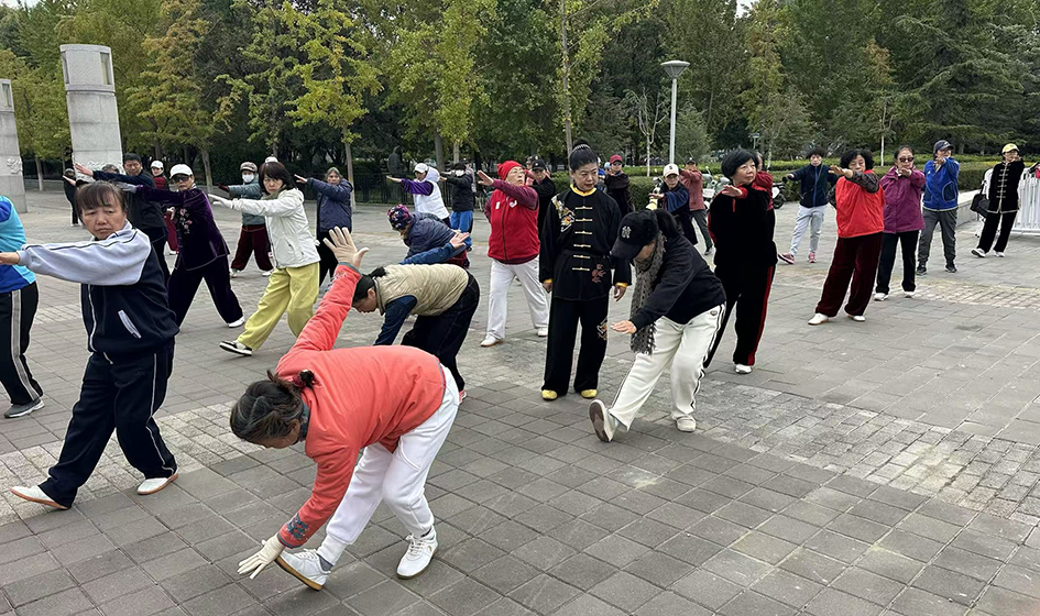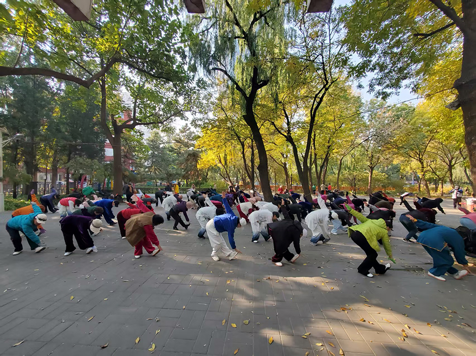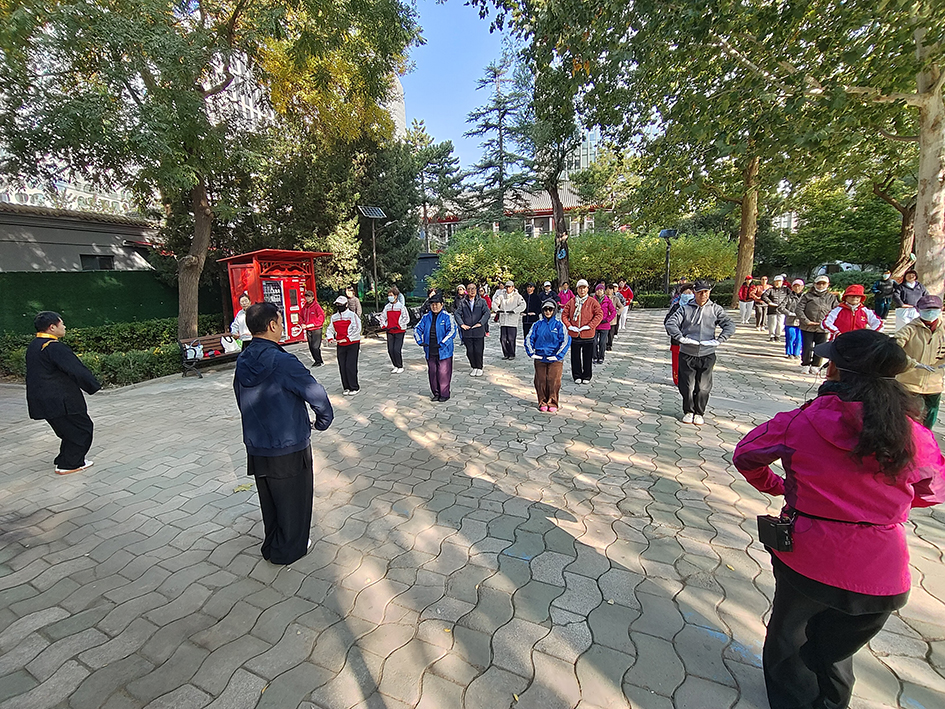 亚运村片区的奥体中心熊猫广场上,70余名学员排成整齐的方阵,随着口令舒展肢体;西坝河片区的健身公园里,老少同场切磋、互帮互助,一招一式尽显健身气功的独特韵味,现场学习氛围浓厚热烈。