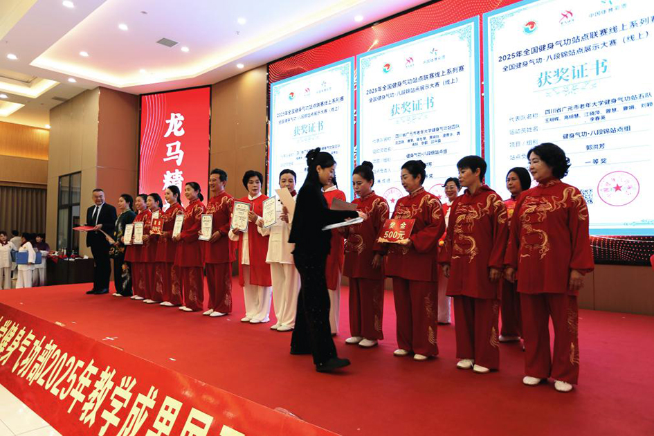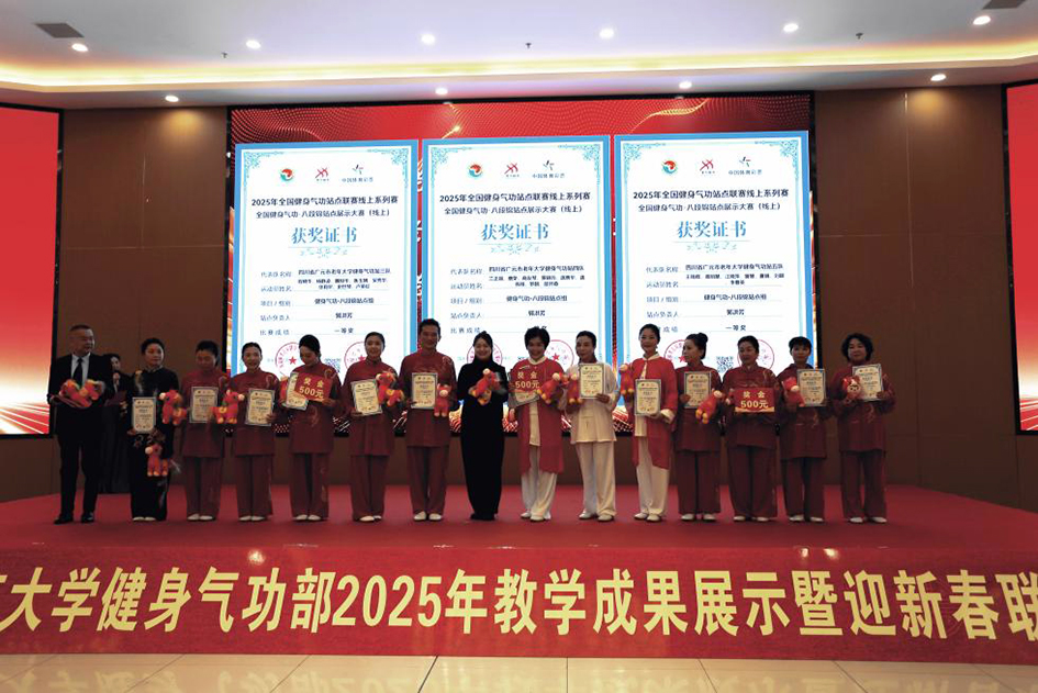 活动中特别设置了表彰环节,将气氛推向高潮。大会首先对在“全国八段锦网络比赛”中荣获一、二、三等奖的站点及家庭组队伍进行了隆重表彰,肯定了他们在更高平台上为学校赢得的荣誉。随后,大会颁发了年度“优秀学员”与“优秀学生干部”奖项,获奖代表们分享了他们将健身气功融入生活、改善身心的真切体会,其朴实而真挚的发言引起了广泛共鸣。