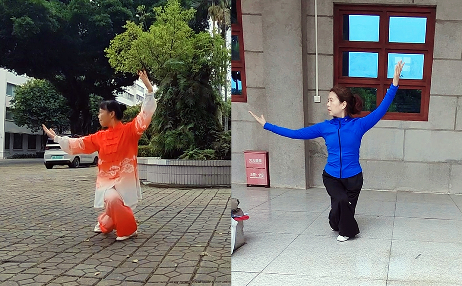 此后,两地线上联动不断:邓老师带领组建的队伍先通过视频初步习练,再将排练片段实时反馈,我们反复研讨动作衔接、优化队形变化,同时调整背景音乐的视频剪辑。一个月后,当邓老师传来完整的队形演练视频时,我惊喜不已,队形的层次感让作品意象更鲜活,也为动作进行二次创作赋予了空间与生命!