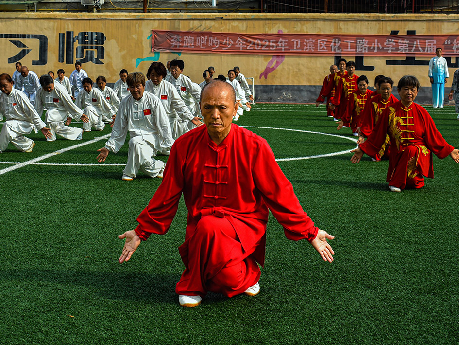 随着冲锋号的余韵渐息,舒缓悠扬的《四季气韵》乐曲缓缓流淌。152 名爱好者动作整齐划一,抬手、转身、屈膝、舒展,在动静交替间演绎着气与舞的完美融合。晨光下,整齐的队列如一幅流动的画卷,每一个招式都透着专注与坚毅,声势浩大、蔚为壮观。大家在演练中相互观摩、彼此交流,不仅展现出扎实的习练功底,更传递出 “以舞会友、共同进步” 的真挚情谊。