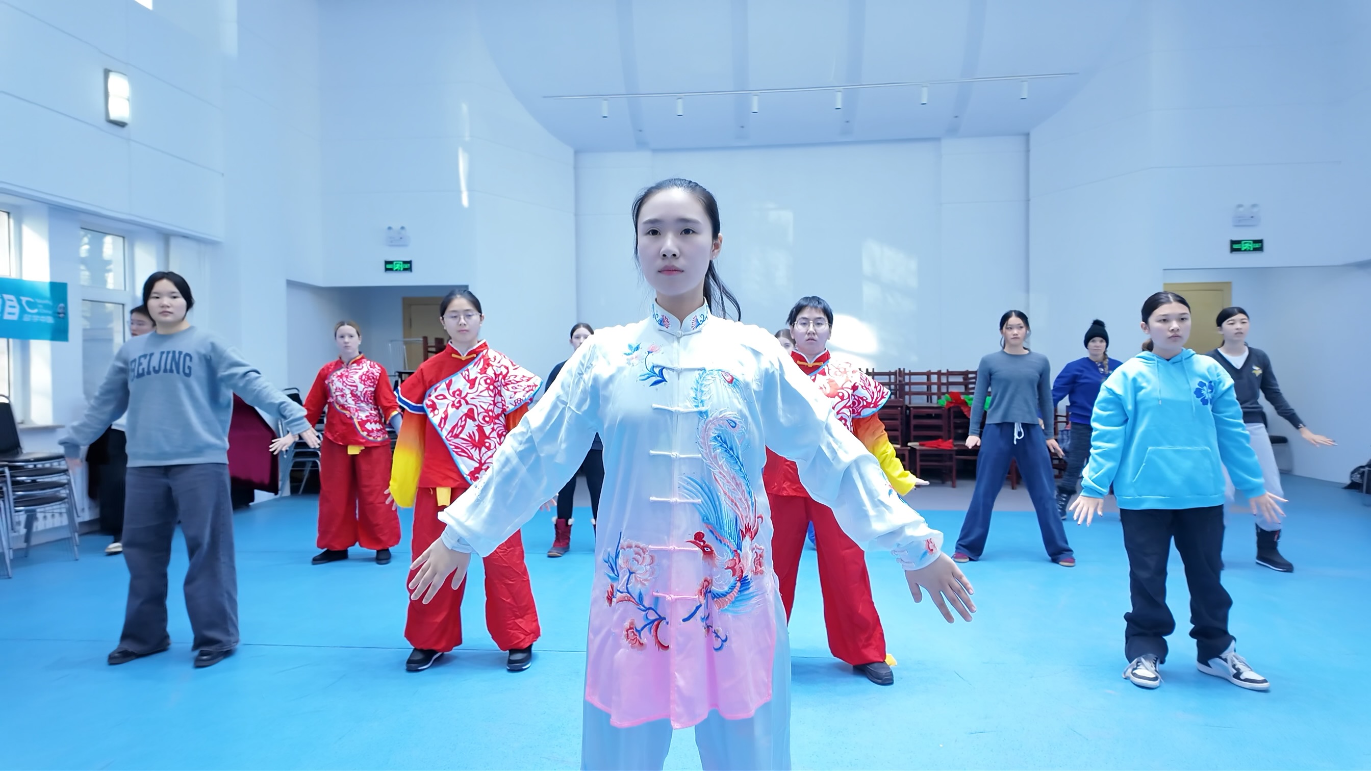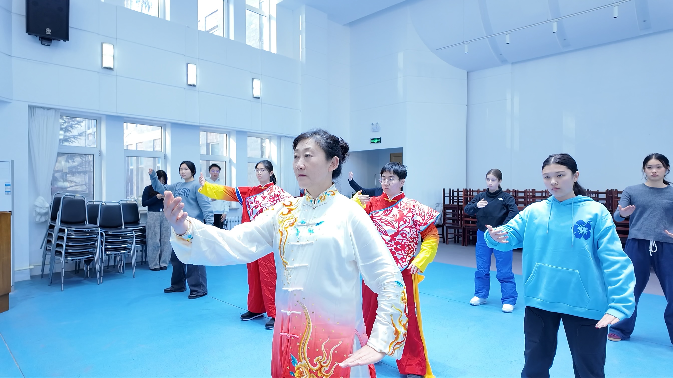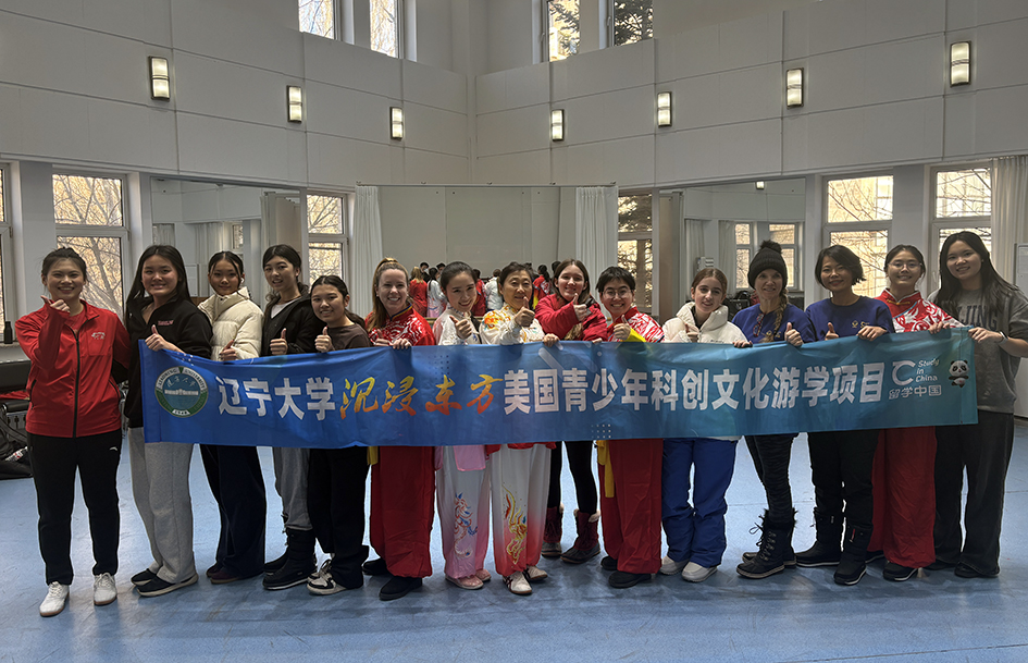 2025年12月31日,沈阳体育学院姜娟教授,同研究生宋珈铭、王熙受邀到辽宁大学国际教育学院为参加“沉浸东方”美国青少年科创文化游学项目的18名师生进行了健身气功·八段锦、五禽戏的展演和教学活动。