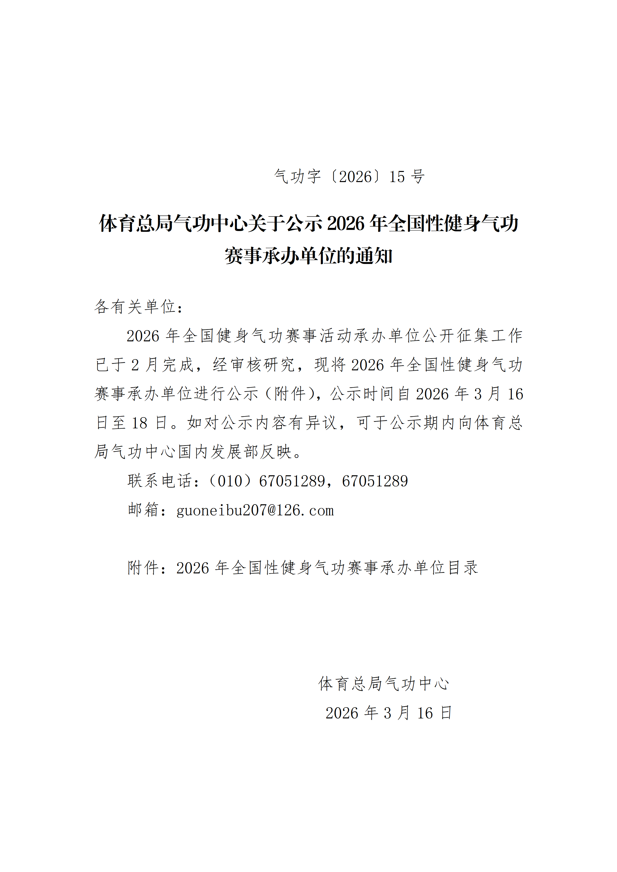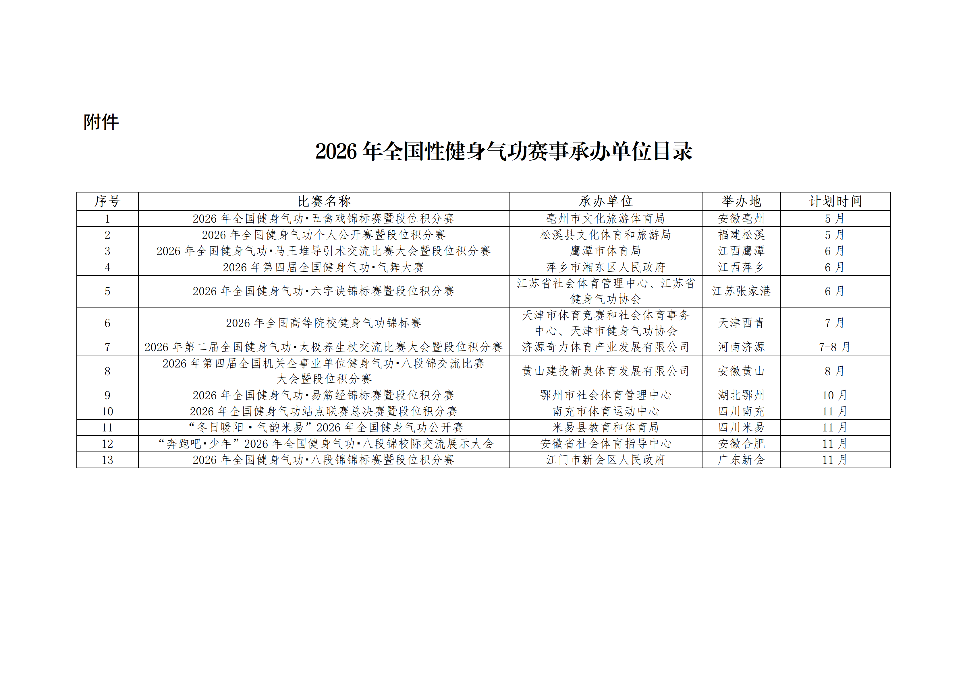 体育总局气功中心关于公示2026年全国性健身气功赛事承办单位的通知