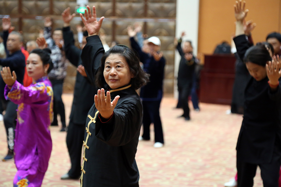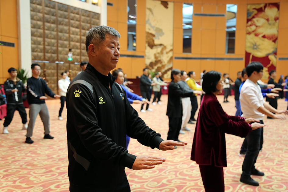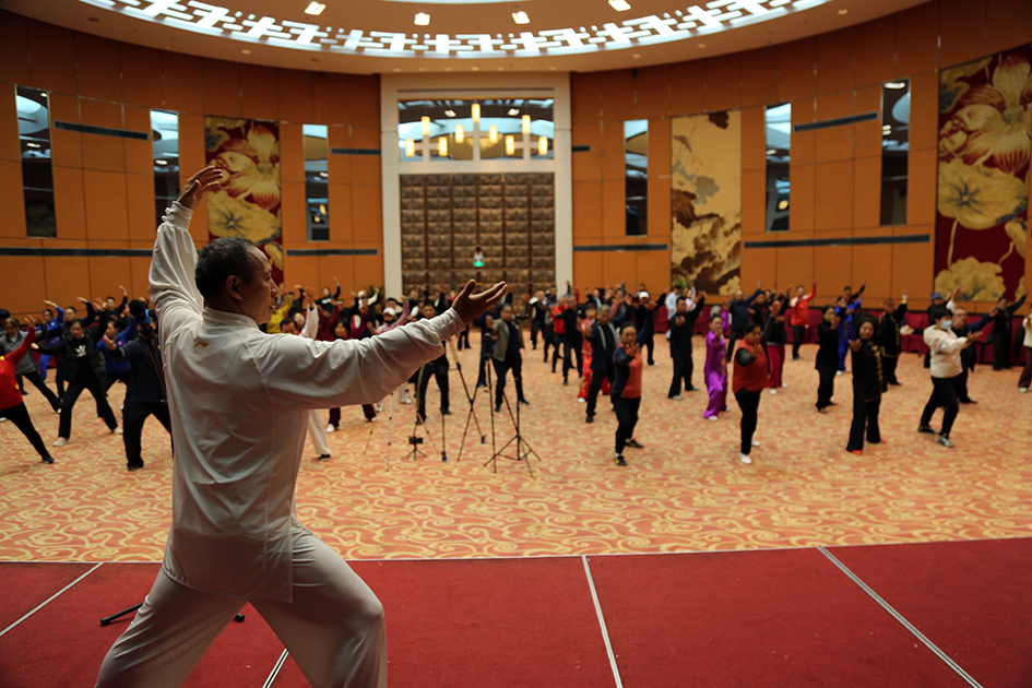 谢教授的武术功底扎实,动作很有气势,在台上一遍接着一遍不知疲倦地示范动作、领功教学。圆形宽敞的培训大厅里,大家也拉开架式,跟着学练起来。